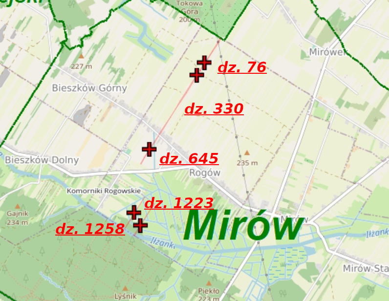Działki nr 1223 i 1258 o powierzchni 0,34 ha i 0,4 ha i wymiarach 5,39m x 650m i 6,18m x 647m,
