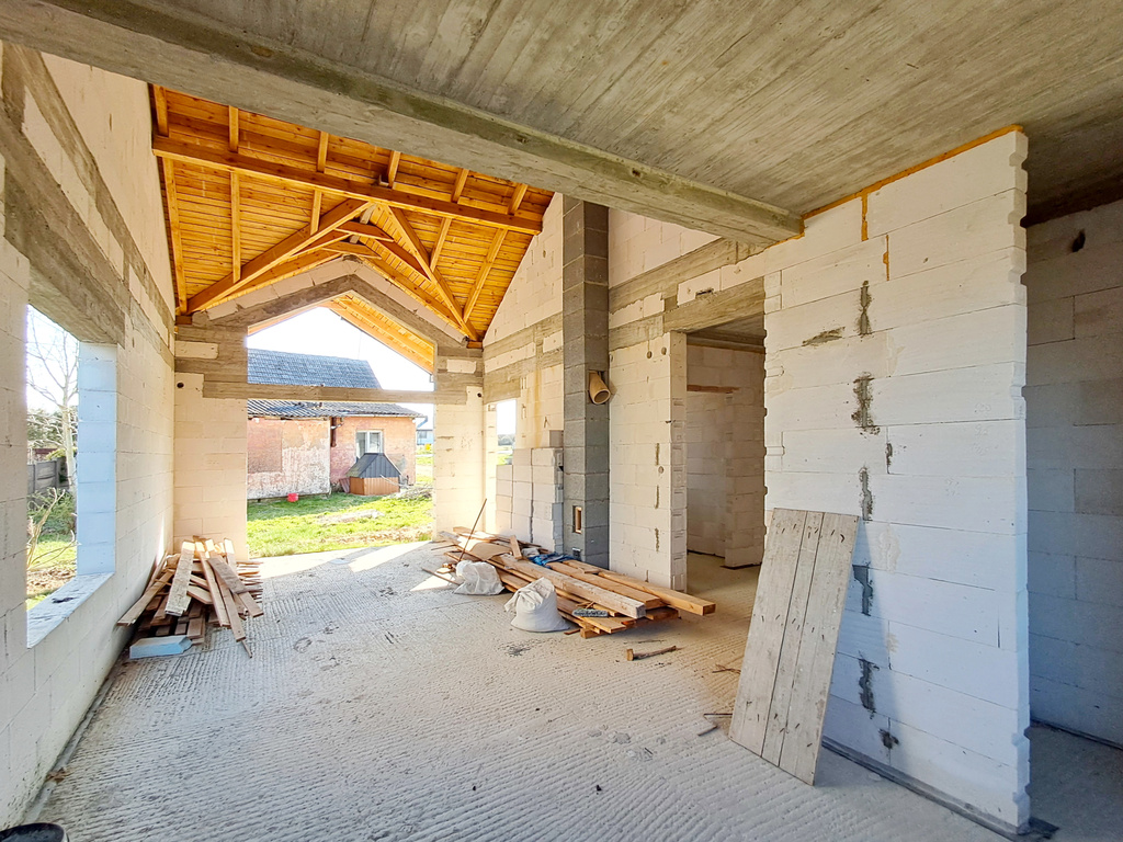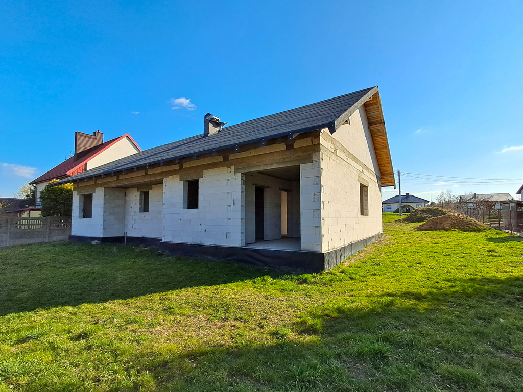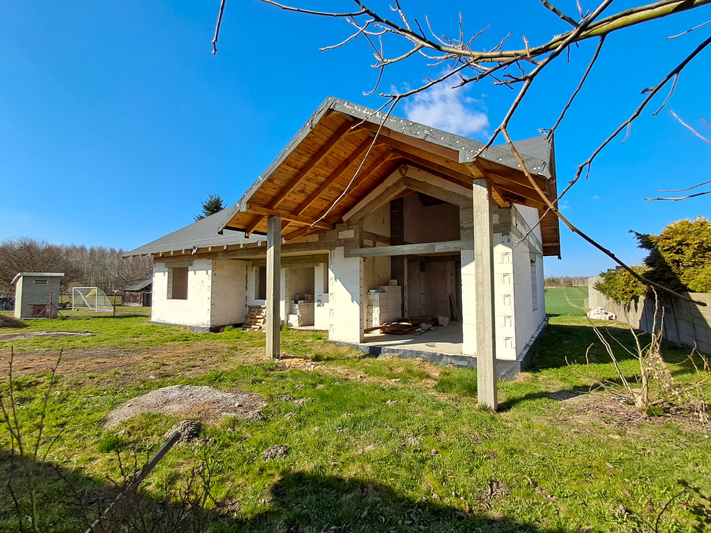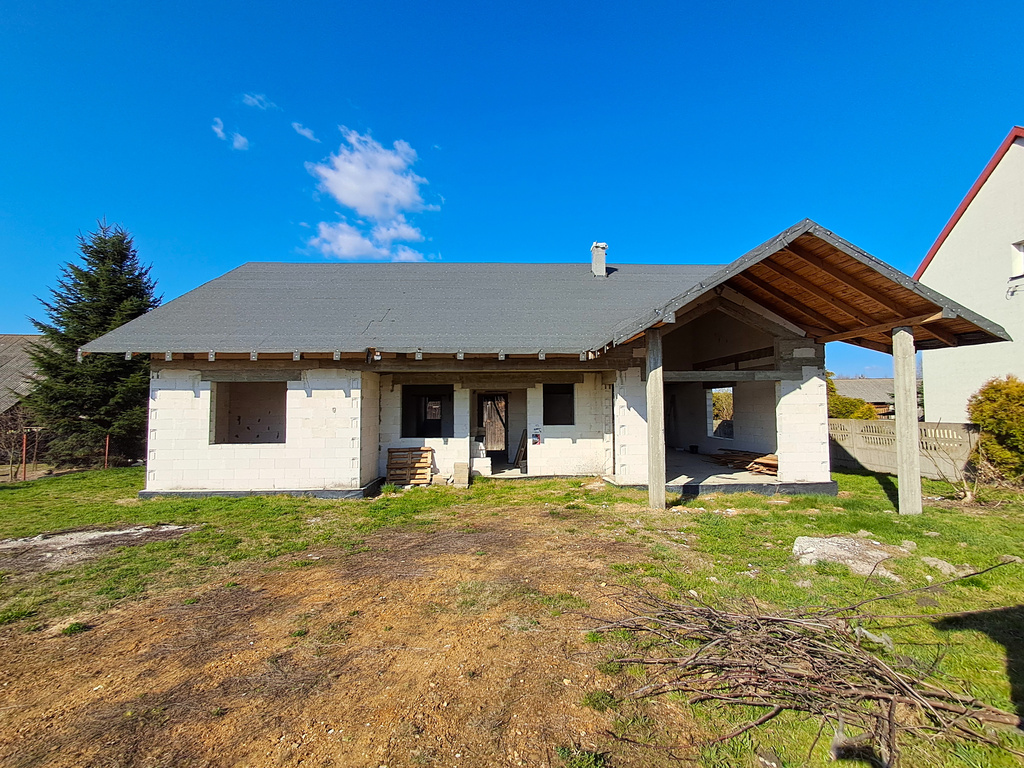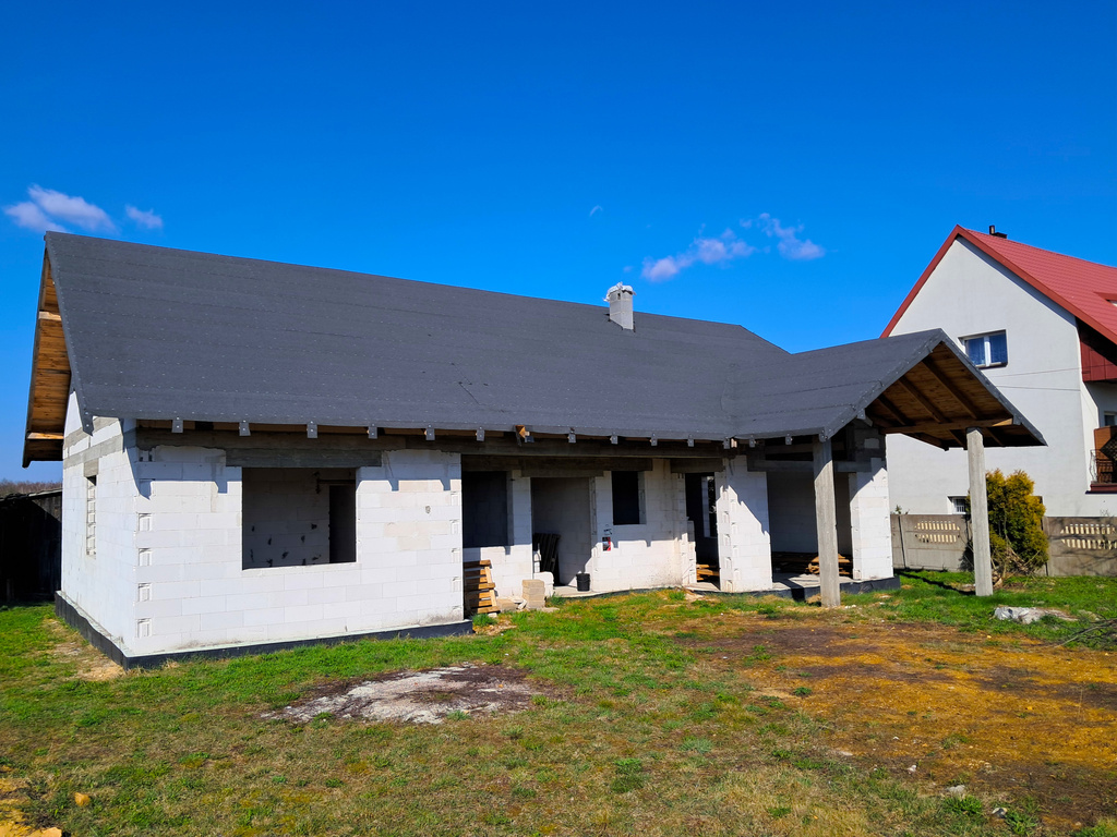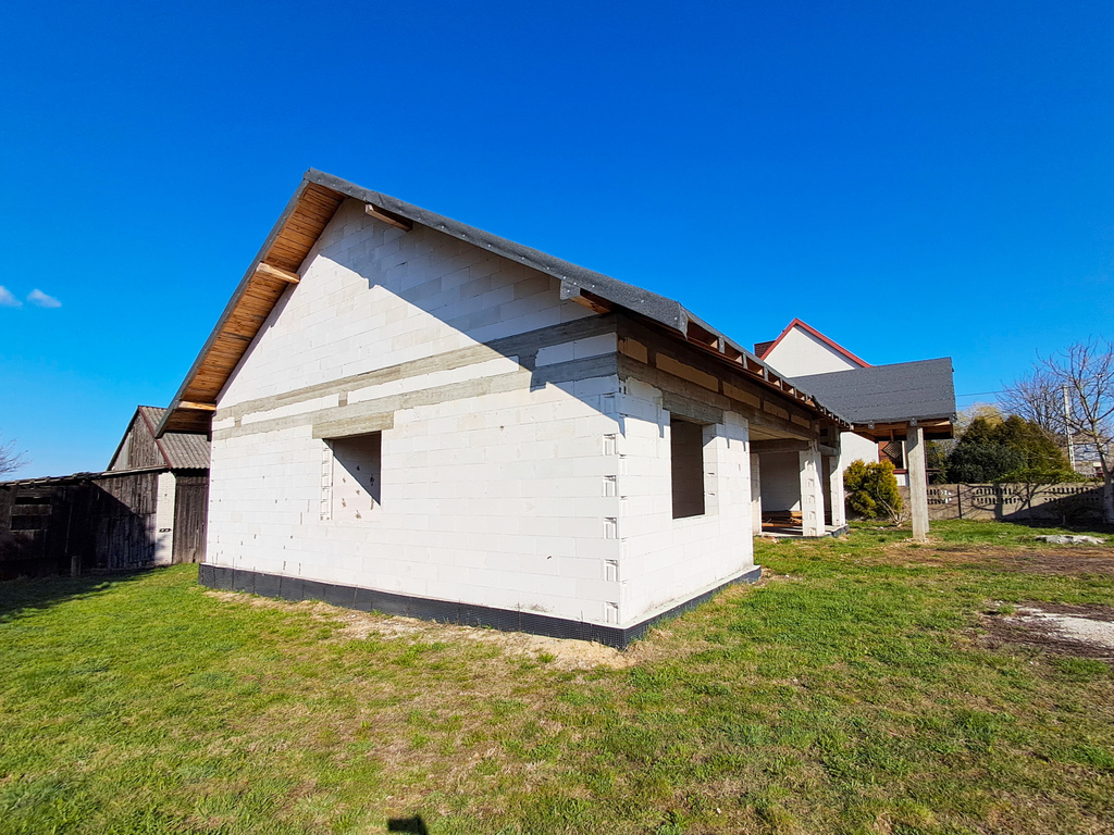 Murowany dom parterowy o powierzchni około 139,69 m2 wybudowany w 2024 roku, w stanie surowym otwartym, położony na działce o powierzchni 5676 m2.