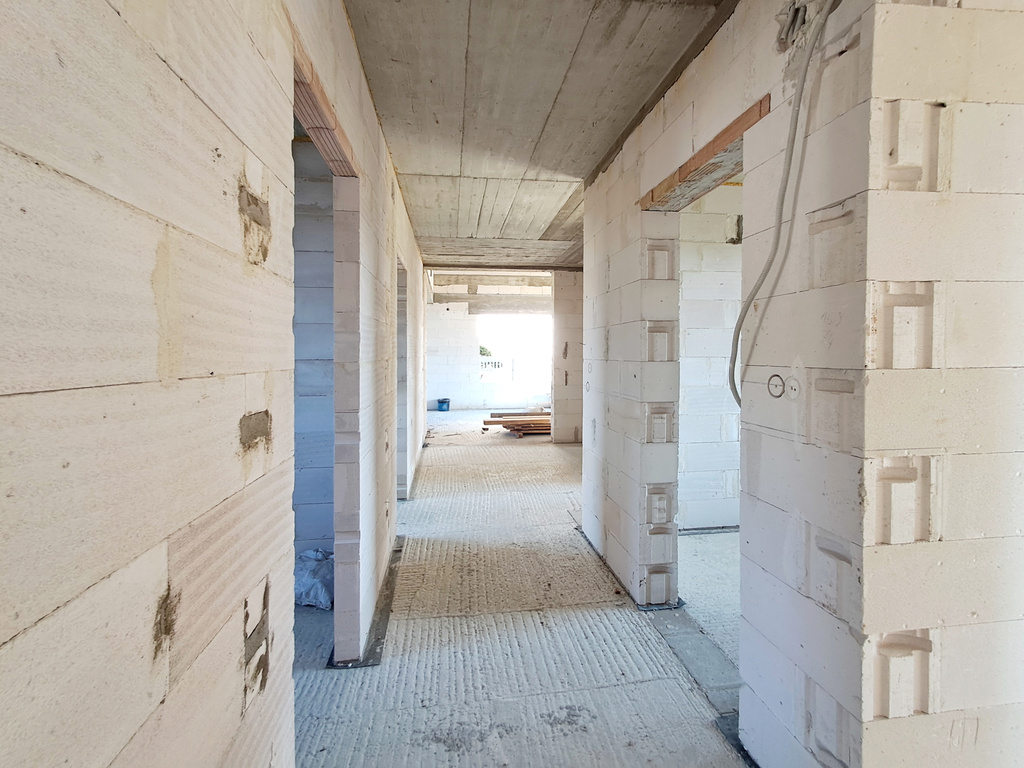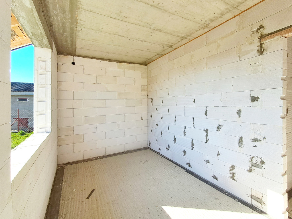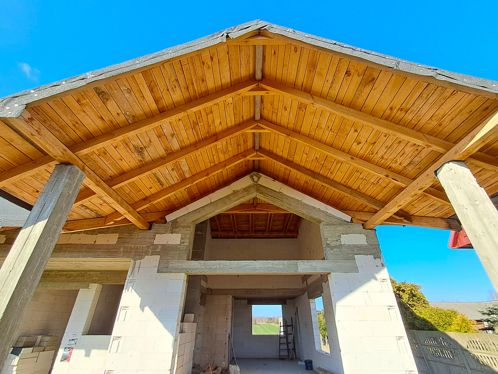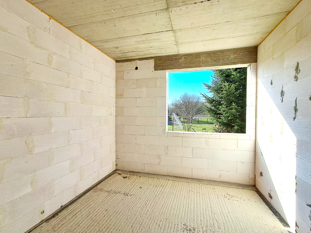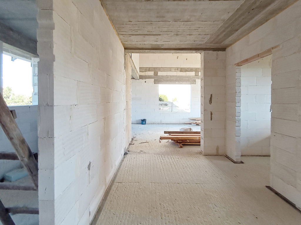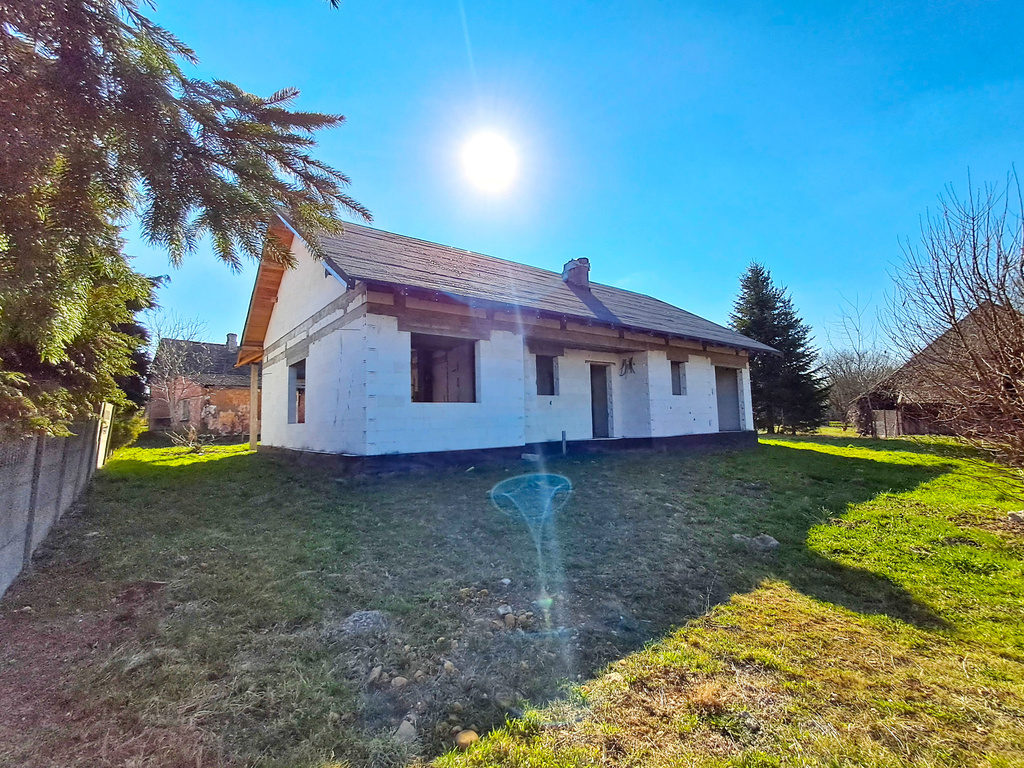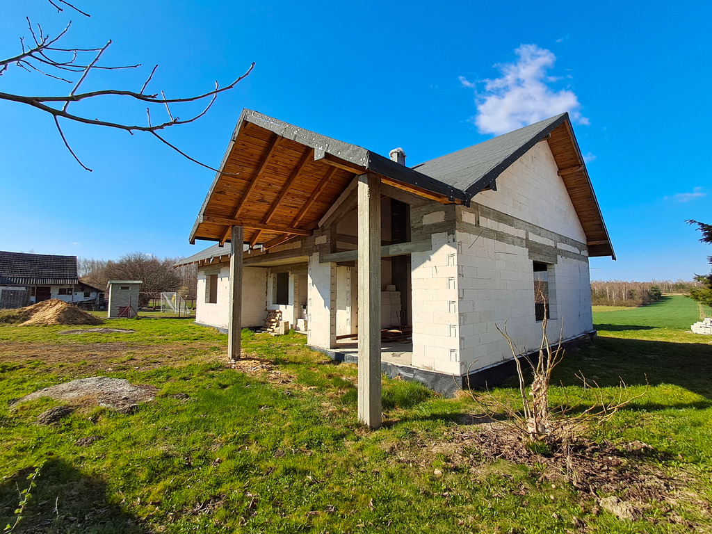 Murowany dom parterowy o powierzchni około 139,69 m2 wybudowany w 2024 roku, w stanie surowym otwartym, położony na działce o powierzchni 5676 m2.