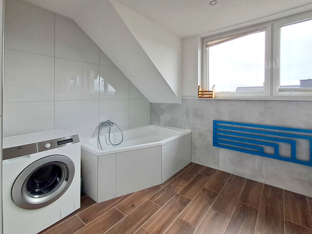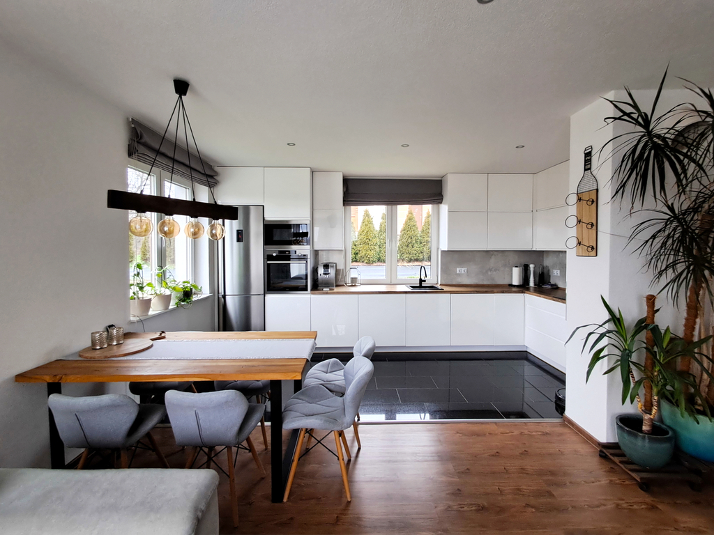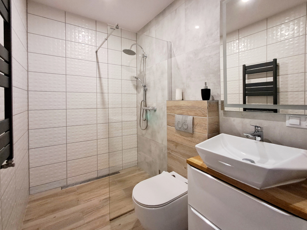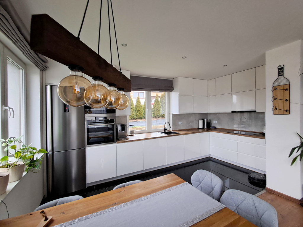 – meble kuchenne z pełnym wyposażeniem: lodówko-zamrażarka, piekarnik elektryczny, kuchenka mikrofalowa, płyta indukcyjna, zmywarka
