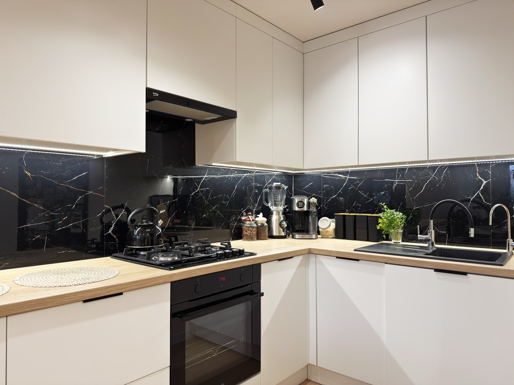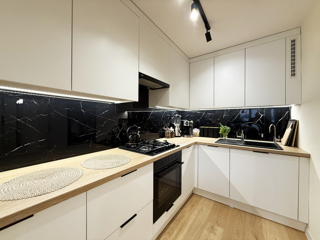 Nieruchomość wykończono ze smakiem w neutralnych odcieniach beżu i bieli. Zabudowa meblowa w kuchni została wykonana przez stolarza na wymiar. Aneks kuchenny jest w pełni wyposażony w sprzęt AGD.