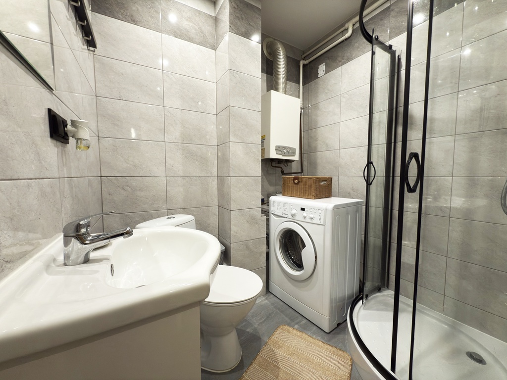– łazienka (~ 3 m²) z kabiną prysznicową.