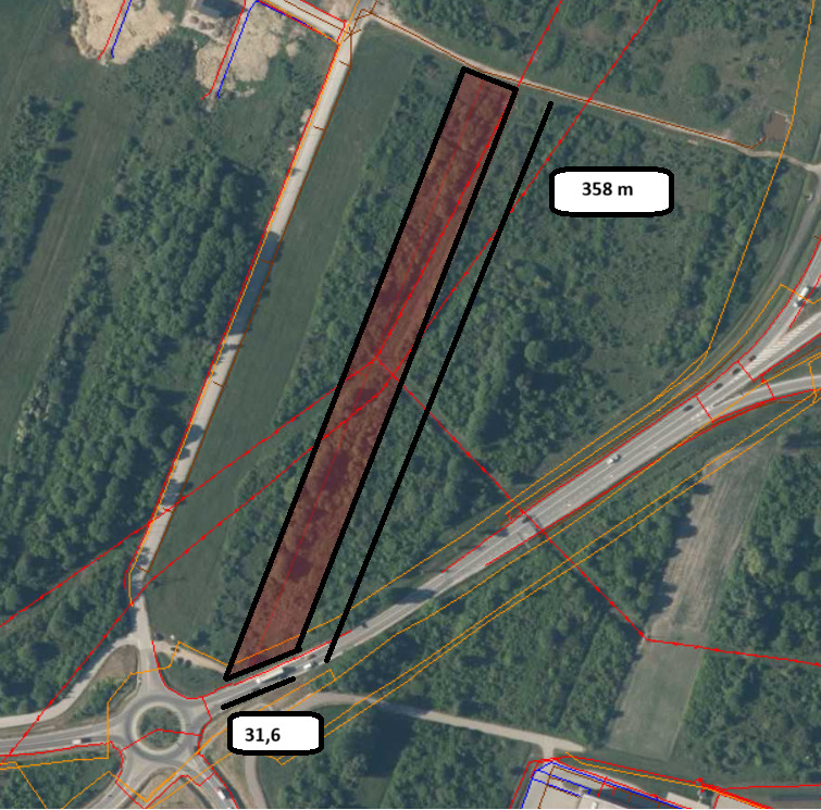 Nieruchomość rozciąga się na długości 358 m i szerokości 31,6 m między dwiema drogami gminnymi, które nie są utwardzone obecnie. W najbliższej drodze asfaltowej mieści się sieć kanalizacyjna i wodna oraz elektryczna.