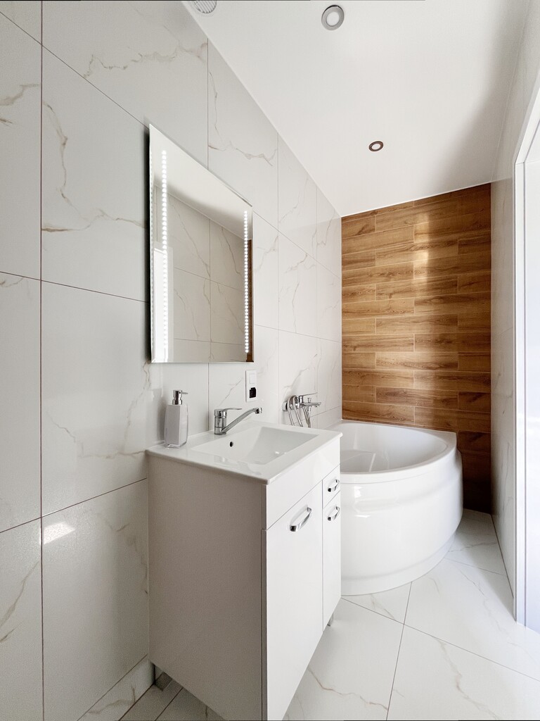 - Podłogi: drewniana deska + płyta OSB + panele; w łazience wykonana wylewka.