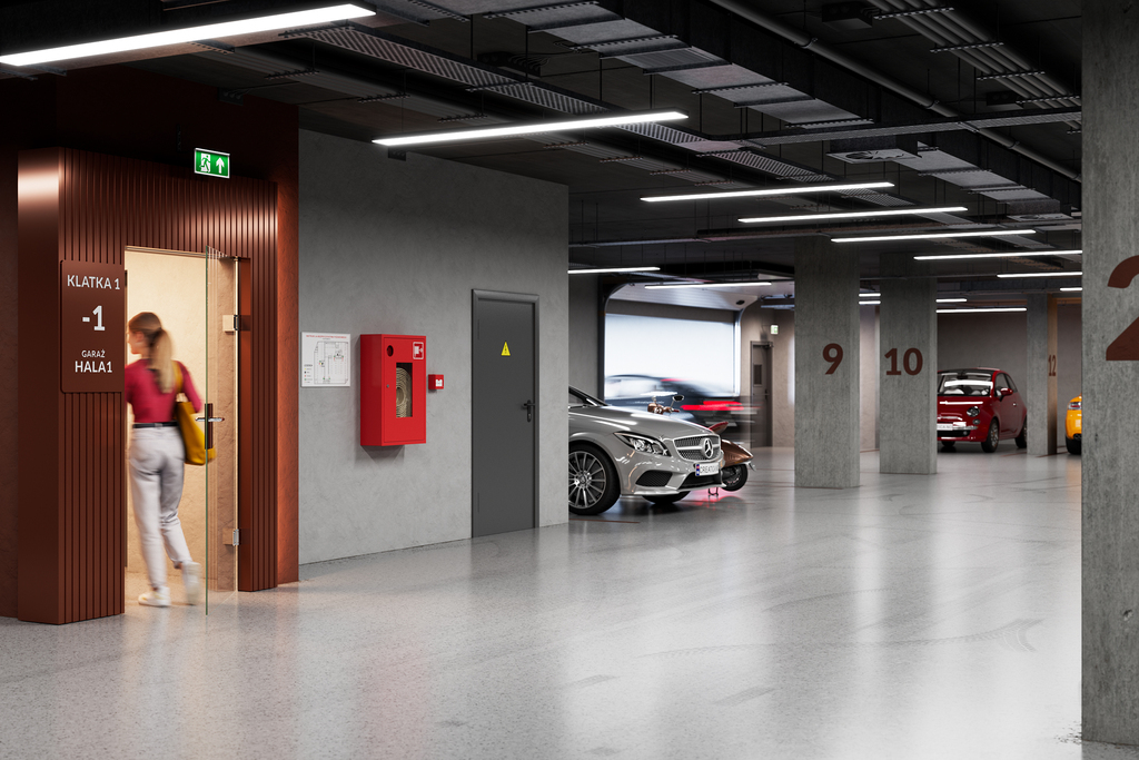 - Garaż podziemny – oferuje łatwy dostęp do 74 miejsc parkingowych oraz 32 komórek lokatorskich.
