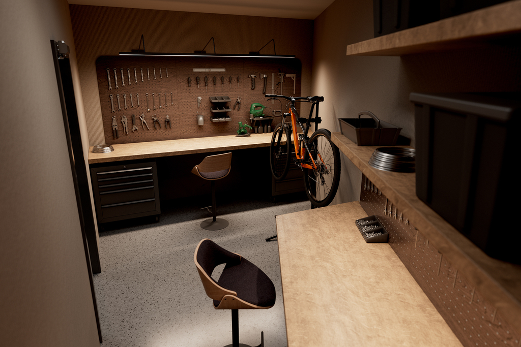 - Pokój majsterkowicza – Czyli w pełni wyposażony pokój z narzędziami ulokowany w piwnicy, służący jako zaplecze do różnych czynności, od majsterkowania przy autach, meblach aż po standardowy serwis rowerów.