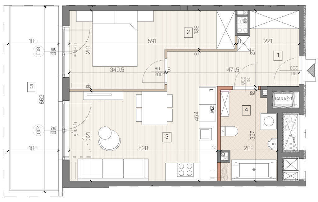 Mieszkanie o powierzchni 44,03 m2 składa się z 2 pokoi z aneksem oraz łazienki. Do lokalu przynależy balkon powierzchni 10,99 m2.