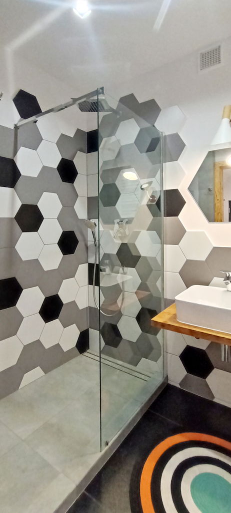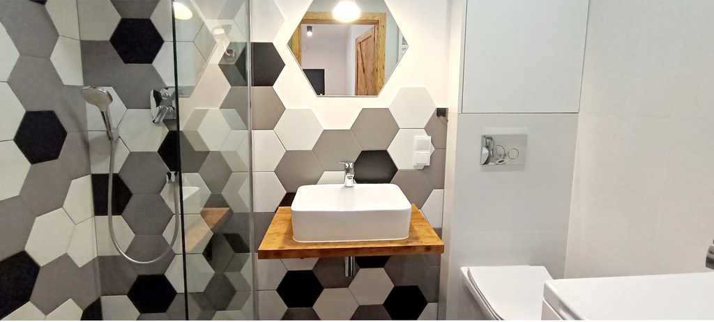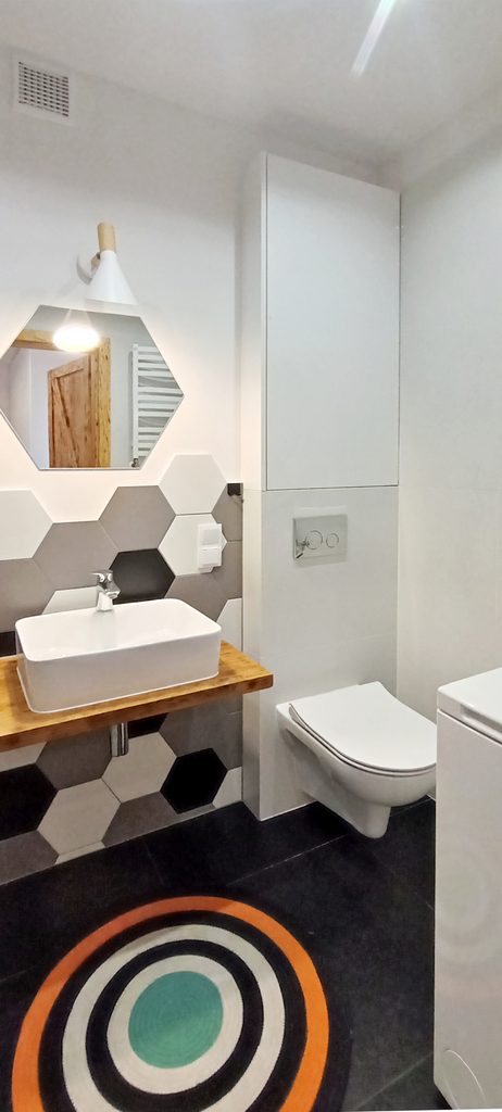 ŁAZIENKA z prysznicem, umywalką, WC oraz pralką
