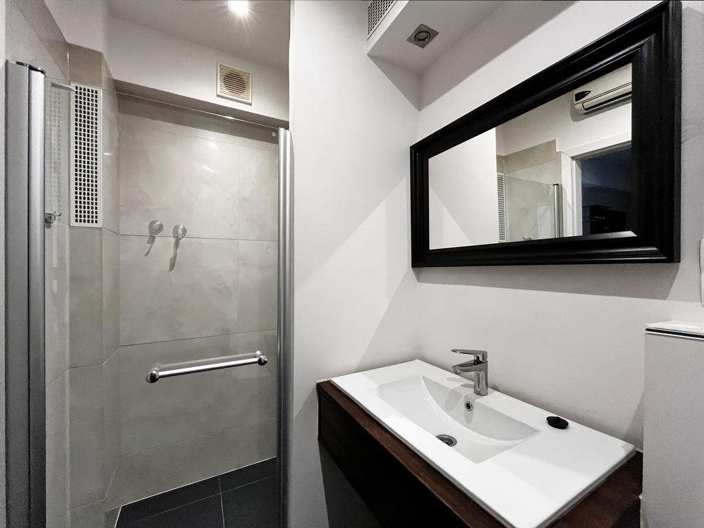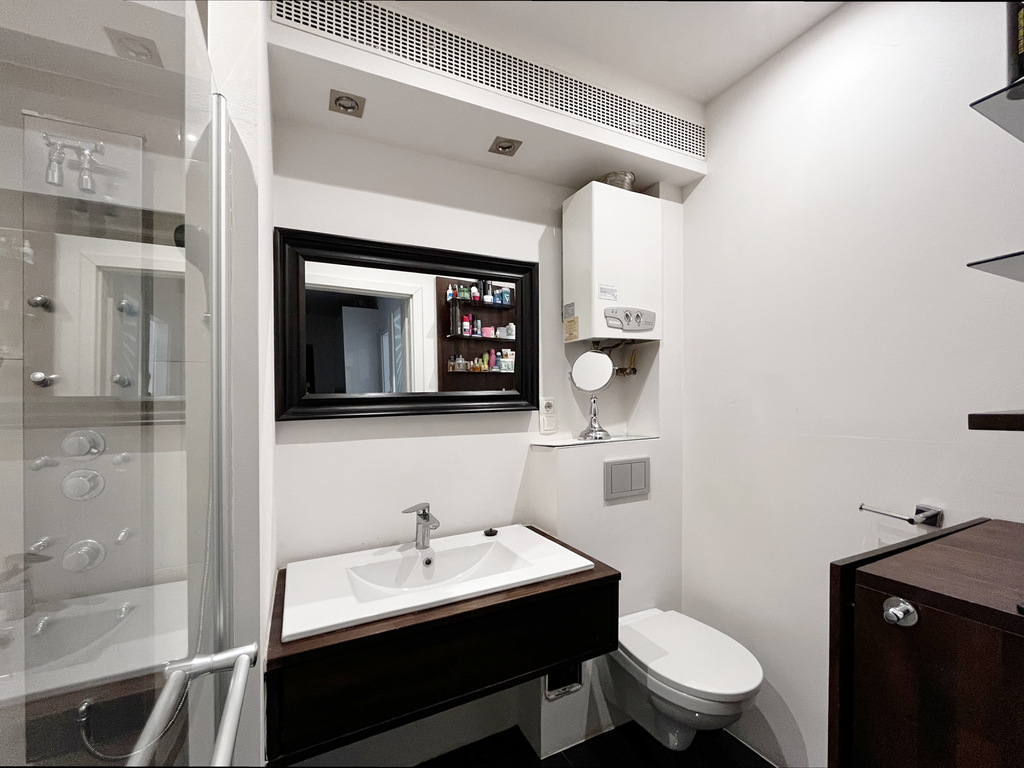 – ŁAZIENKA z prysznicem z odpływem liniowym, WC, umywalką oraz szafkami łazienkowymi,
