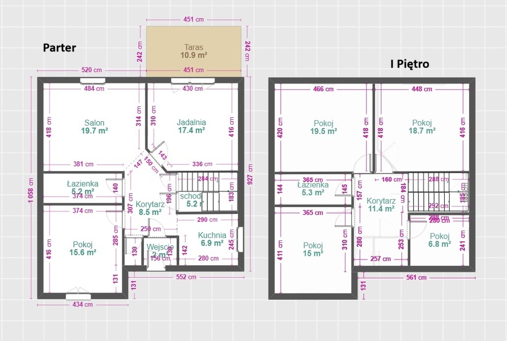 – Parter: 80 m² | Poddasze: 80 m² (stan surowy, wydzielone ścianki – do własnej aranżacji)