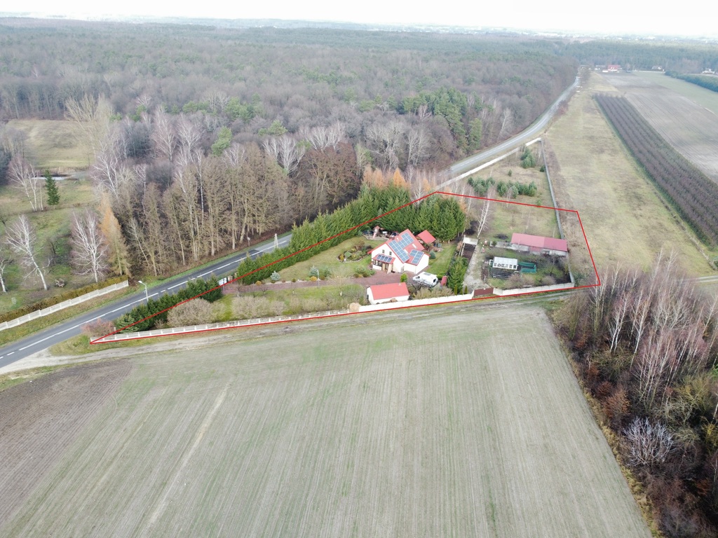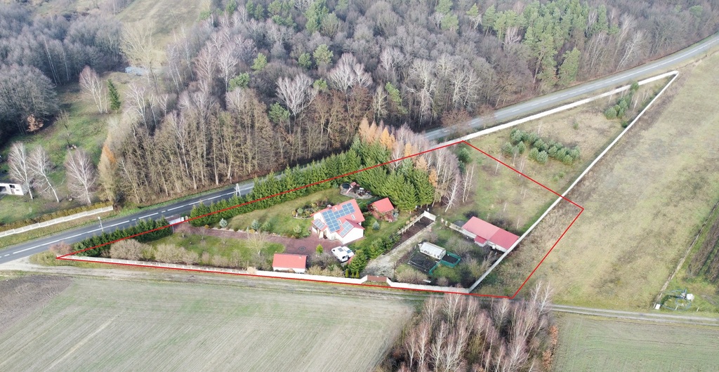 Całkowita powierzchnia działki wynosi 6005 m² i jest ona objęta MPZP – MN3 (tereny zabudowy mieszkaniowej jednorodzinnej). Działka częściowo ogrodzona (wspólne ogrodzenie dla całego terenu ok. 1ha pow. – działka należąca do krewnych właścicieli). Do posesji przynależy dodatkowy pas o szerokości ok. 10m za ogrodzeniem od strony wschodniej. Nieruchomość położona jest w otoczeniu lasu, pól i sadów. Brak sąsiadów „za płotem”!