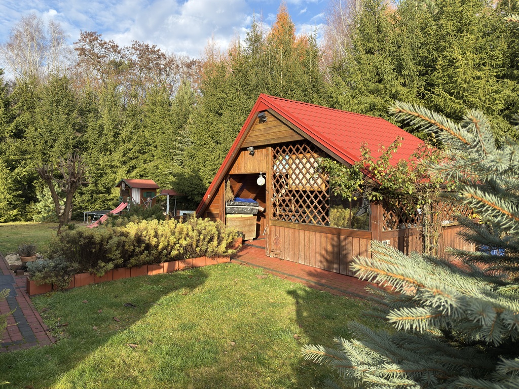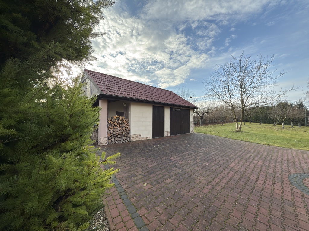 Dookoła domu znajduje się odgrodzony teren od pozostałej części nieruchomości o pow. ok. 2900 m². Poza domem znajdziemy tutaj: dużą altanę wyposażoną w grill gazowy oraz ławę z siedziskami dla 12 osób, budynek gospodarczy (obecnie warsztat, możliwość wykorzystania jako dodatkowy garaż), wędzarnie oraz kuchnie letnią (piec na drewno z fajerkami). Dodatkowo część posesji została zaadoptowana jako kącik wypoczynkowy z parasolem, trampoliną, huśtawkami i domkiem dla dzieci. Podjazd wyłożony został kostką, a dostępu strzeże brama automatyczna otwierana pilotem. Wzdłuż ogrodzenia rosną drzewka owocowe (śliwy i jabłonie) oraz orzechy włoskie i leszczyna (orzechy laskowe).