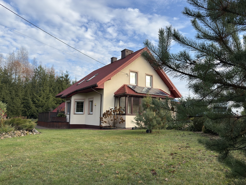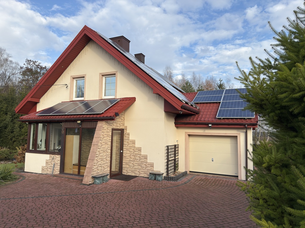 Dom w stanie bardzo dobrym, sprzedawany z umeblowaniem widocznym na zdjęciach. Nieruchomość posiada własną studnię głębinową oraz dostęp do wodociągu. W domu zainstalowano centralny filtr wody. Na dachu, krytym blachodachówką, zamontowano panele fotowoltaiczne o mocy 8kW. Dodatkowo nieruchomość została wyposażona w agregat prądotwórczy. Zastosowane rozwiązania pozwalają na niskie koszty utrzymania nieruchomości (opłaty za prąd średnio miesięcznie wynoszą 40zł, a za wodę kwartalnie 14zł!). Do domu doprowadzony jest światłowód. Budynek posiada dwa główne źródła ogrzewania: piec na pellet (rocznie zużycie 1,5-2 tony) oraz kominek. Ponadto na każdej z kondygnacji zainstalowana jest klimatyzacja z funkcją grzania.