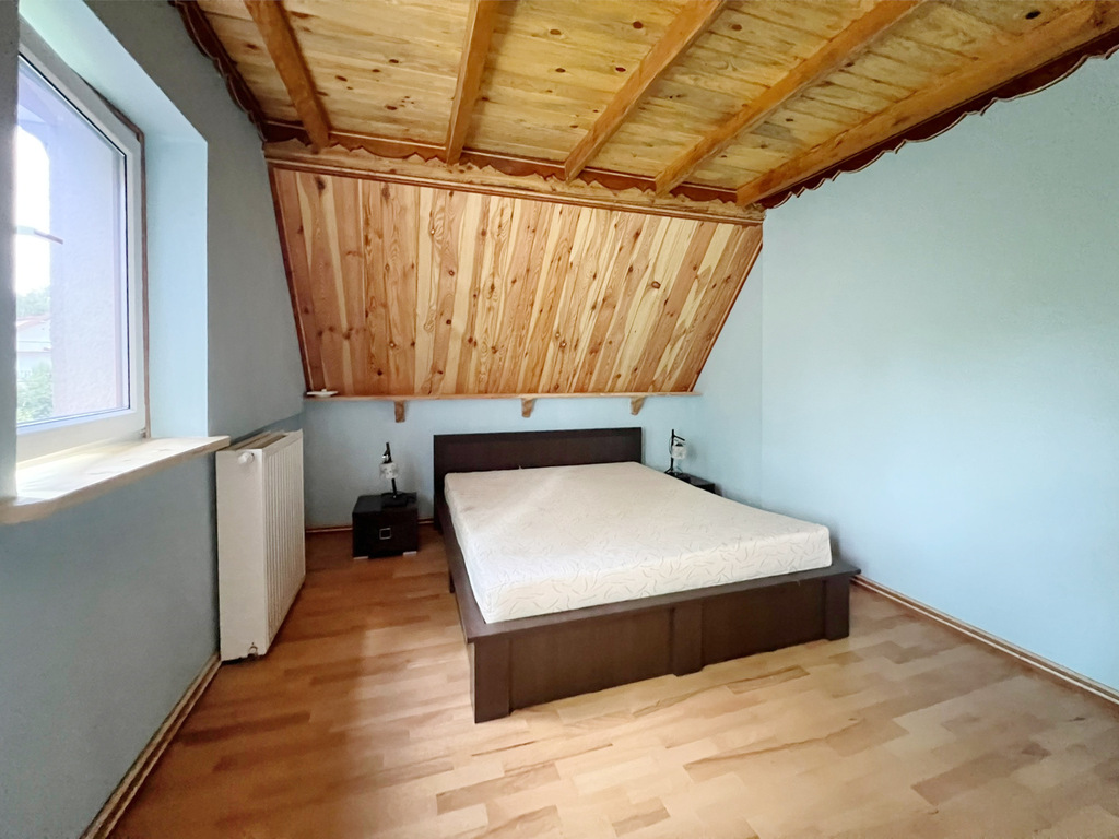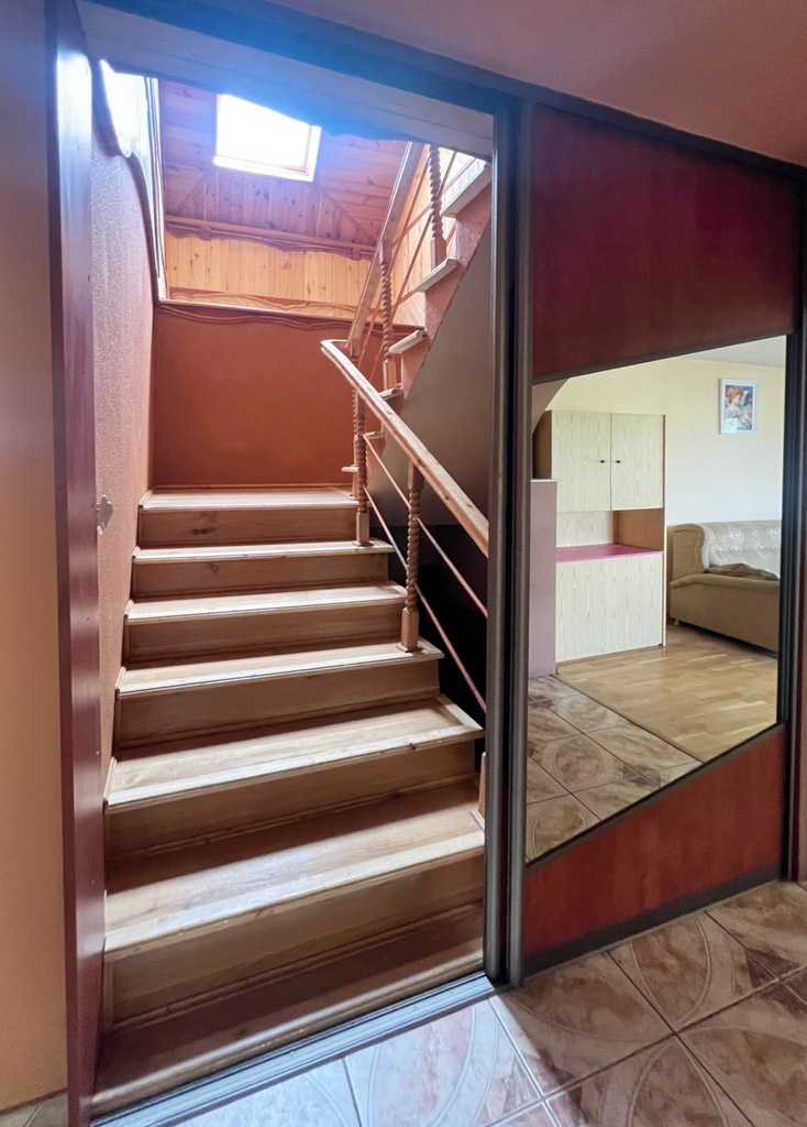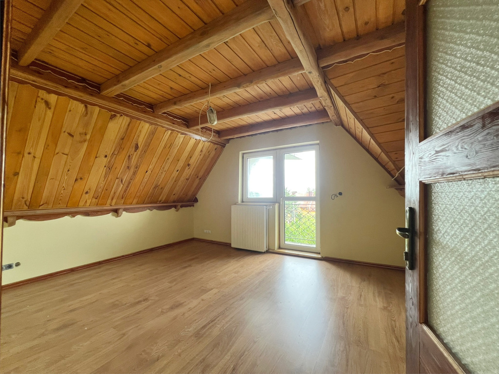 - Piętro: trzy sypialnie (jedna z balkonem!), schowek i łazienka – prywatna strefa wypoczynku dla domowników.